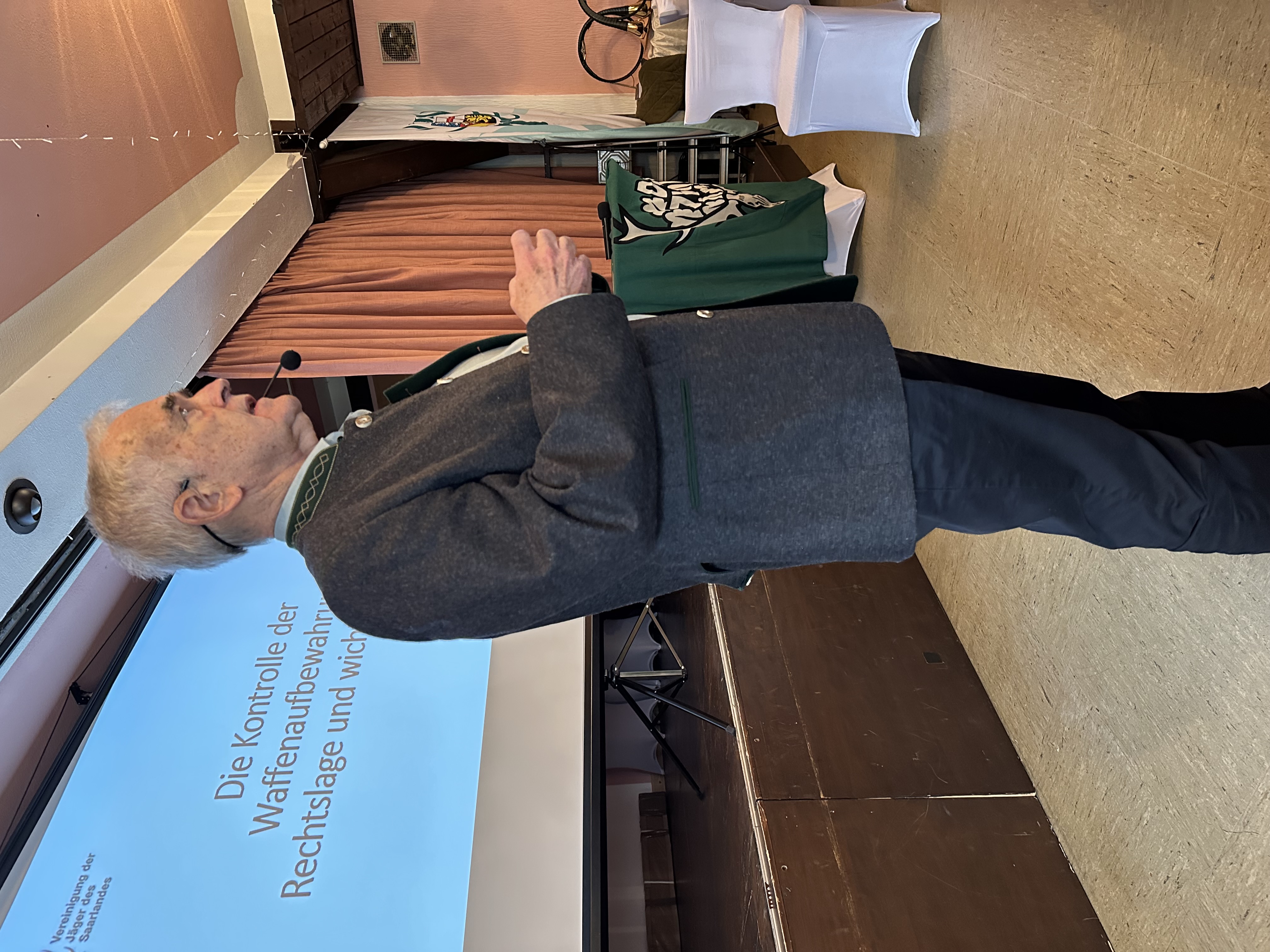 Ein leidiges Thema hatte Kreisjägermeister Heiner Kausch zu bearbeiten und den Anwesenden näher zu bringen, was ihm aber hervorragend gelang: Die Waffenaufbewahrung. Was sich für Außenstehende einfach anhört, ist für die Legalwaffenbesitzer gar nicht so einfach. Das Waffenrecht ist leider äußerst komplex und unübersichtlich. Wenn Fehler gemacht würden, gingen die saarländischen Waffenbehörden seit einiger Zeit auch bei kleinen Fehlern leider nur noch von „gröblichen Verstößen“ aus. Dies entspräche aus seiner Sicht weder dem Wortlaut noch dem Sinn des Waffengesetzes. Das Waffengesetz sehe auch die Möglichkeit der „Nachbesserung“ vor und funktioniere nicht nach dem „Alles-oder-Nichts-Gesetz“. Er bat die politisch Verantwortlichen im Saarland und in den Landkreisen, wieder zu Behördenhandeln mit Augenmaß zurückzukehren.